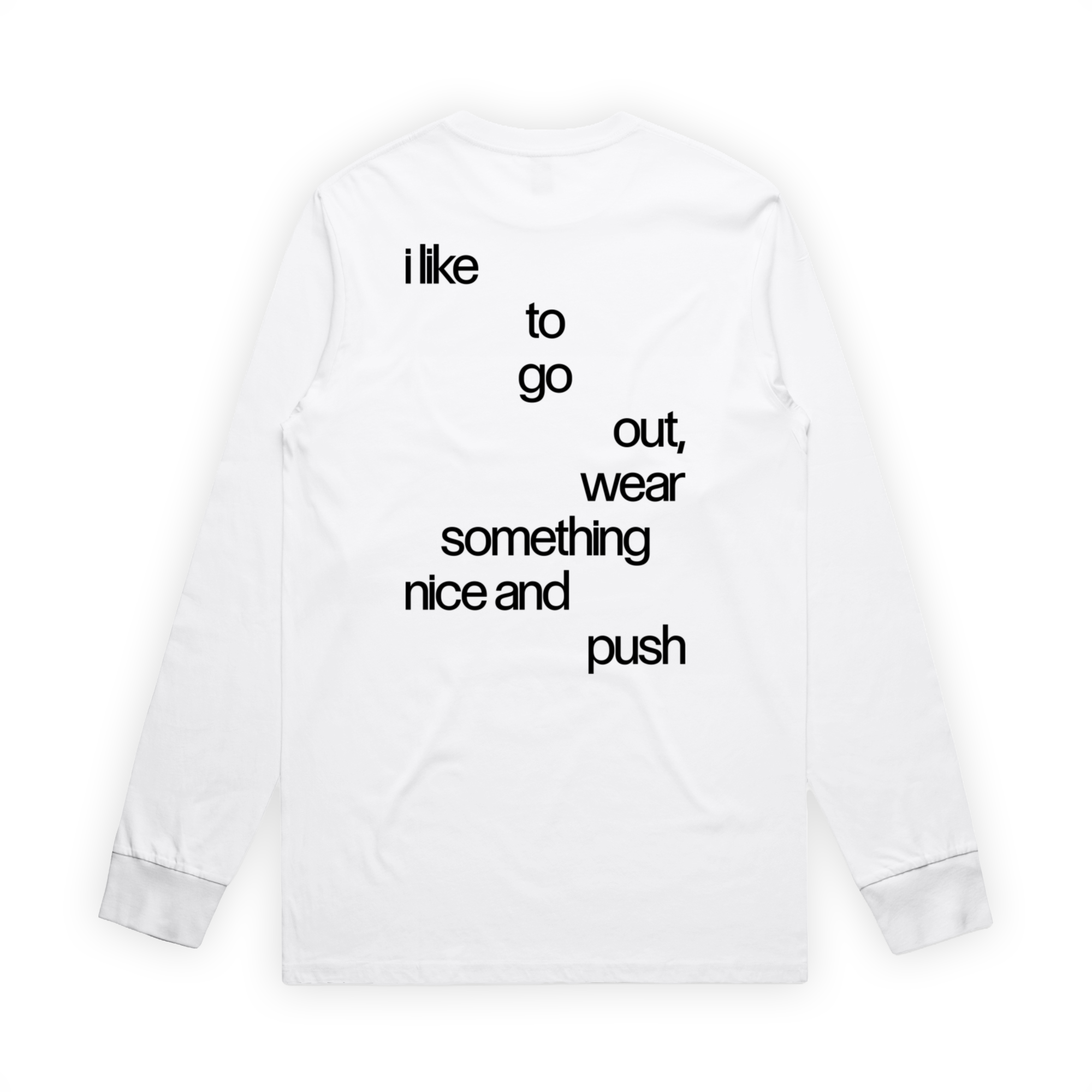 White long sleeve T-shirt with Sexistential logo on front and featuring “I like to go out, wear something nice and push” lyrics on back.